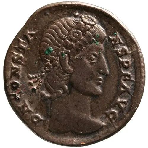 | Aversbeschreibung | Head of Constans, laureate, rosette-diademed, right. |
