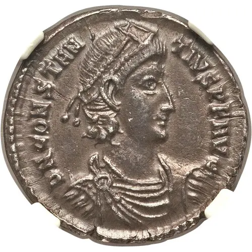 | 正面描述 | Bust of Constantius II, pearl-diademed, draped, cuirassed, right. |