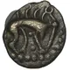 Descrição do reverso Horse right, solid head, reign from chest to nose. `Stickman` below. Pellet triad either side of pellet in ring above.