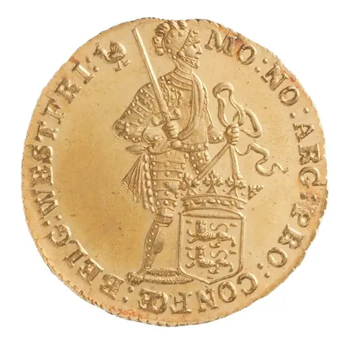| 正面描述 | Knight in armor standing to right, holding sword in right hand against shoulder and ribbon in left hand, a crowned shield with arms of West Friesland at his feet. Legend ends with privy mark. |