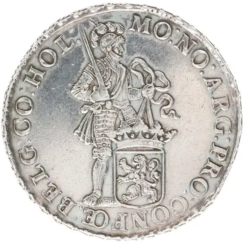 | Obverse description | Standing armored knight facing right, wearing helmet with ornate plume, holding sword on right shoulder, and ribbon in left hand suspending crowned arms of Holland |