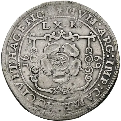 Legenda do anverso ✿ NVM : ARG : CAME : AC. CIVIT : HAGENO : LX . K . 1669