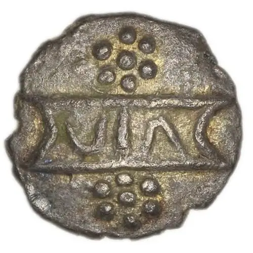 | Descripción del anverso | Inscription in panel. Pellet daisy above and below. |
