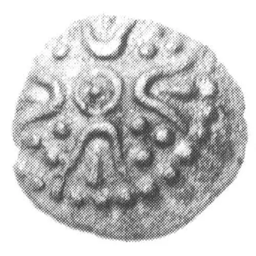 | Описание аверса | Geometric pattern based on four crescents (line inside each) around pellet in ring. Three pellets between crescents. |