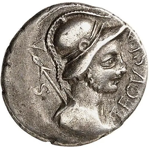 | Obverse description | Helmeted bust right, spear and arrow left. |