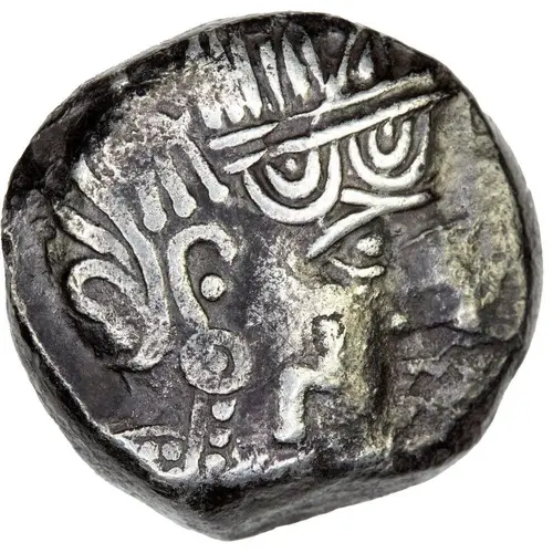 | Aversbeschreibung | Bust of Athena right, wearing crested ornamented helmet. Mark of value on cheek. |