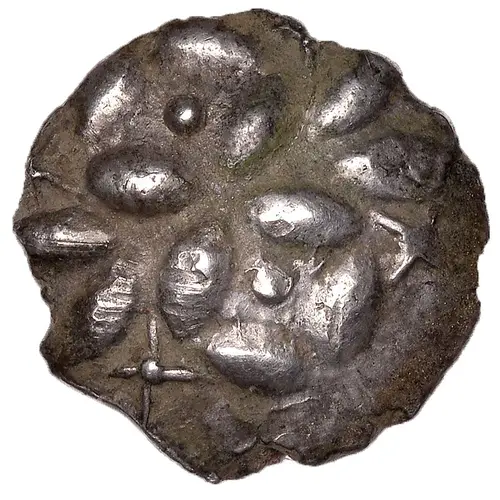 Enlarged Apollo-wreath filling field, extra leaves each side of centre forming circle, pellet within. Crosses in four quarters. |