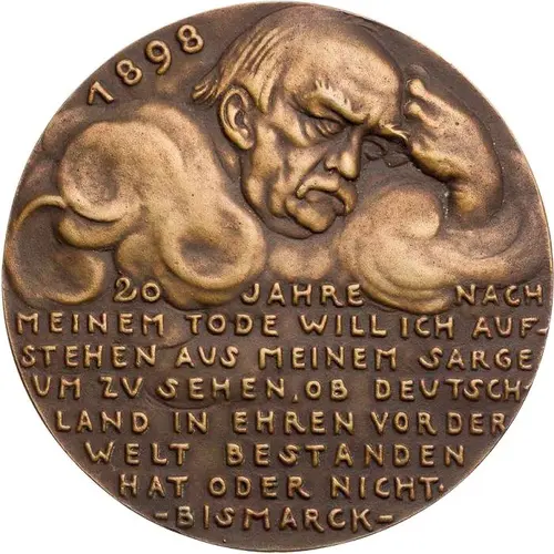 | Obverse lettering | 1898 20 JAHRE NACH MEINEM TODE WILL ICH AUF- STEHEN AUS MEINEM SARGE UM ZU SEHEN. OB DEUTSCH- LAND IN EHREN VON DER WELT BESTANDEN HAT ODER NICHT. -BISMARCK- |
