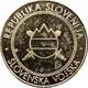 | Reverse description | Two crossed swords behind depiction of Slovenian flag in circle (colored) with circle having three peaks above, which symbolize Triglav - highest mountain in Slovenia. |
