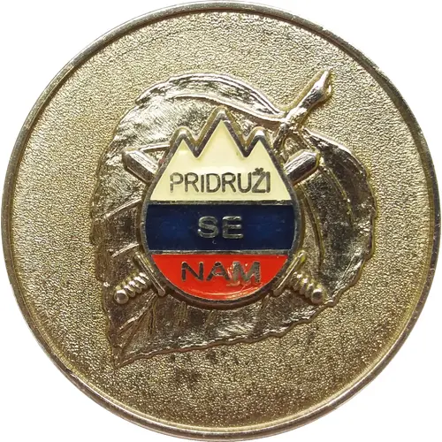| Obverse description | Two crossed swords behind depiction of Slovenian flag in circle with circle having three peaks above (lettering within), which symbolize Triglav - highest mountain in Slovenia, all together placed on linden tree leaf as a symbol of Slovenian nationhood. |