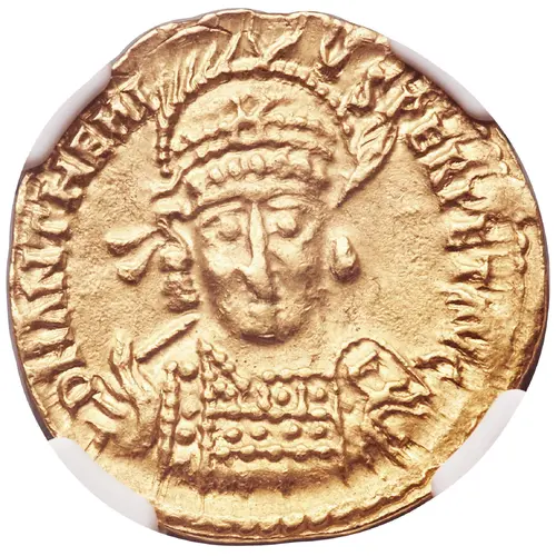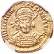 Pearl-diademed, helmeted, cuirassed bust of Anthemius facing, spear in right hand over shoulder, shield in left decorated with horse motif. |