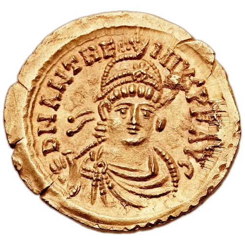 Bust of Anthemius, helmeted, pearl-diademed, draped, cuirassed, facing front, holding spear in right hand behind head and shield decorated with cross behind left shoulder. |