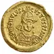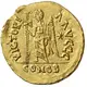 Bust of Romulus Augustulus, helmeted, pearl-diademed, cuirassed, facing front, holding spear in right hand behind head and shield decorated with horseman on left arm. |