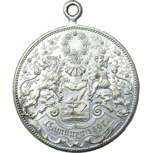 | Obverse description | Helmeted gardening arms supported by lions, rose wreath above and rose branches to the upper sides, inscription in cartouche below with date. |