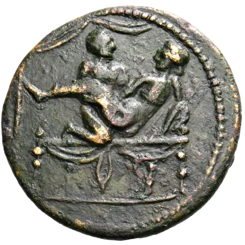| Obverse description | Erotic scene on a table. Curtains around. Border of dots. |