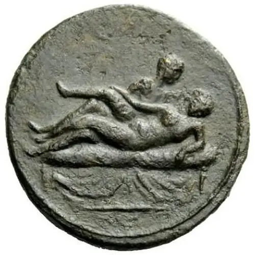 Obverse description Erotic scene on a decorated bed. Border of dots.