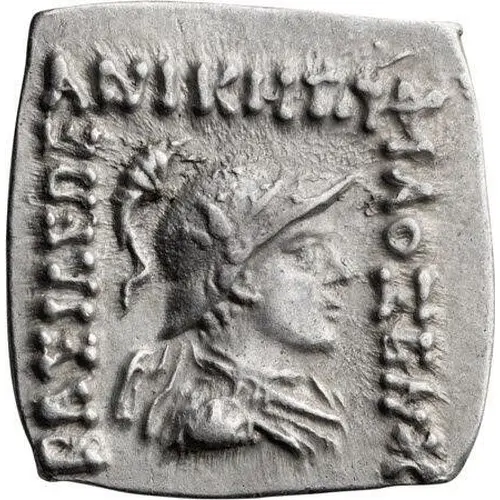 Popis líce Diademed, draped, and cuirassed bust right, wearing helmet decorated with bull`s horn and ear.