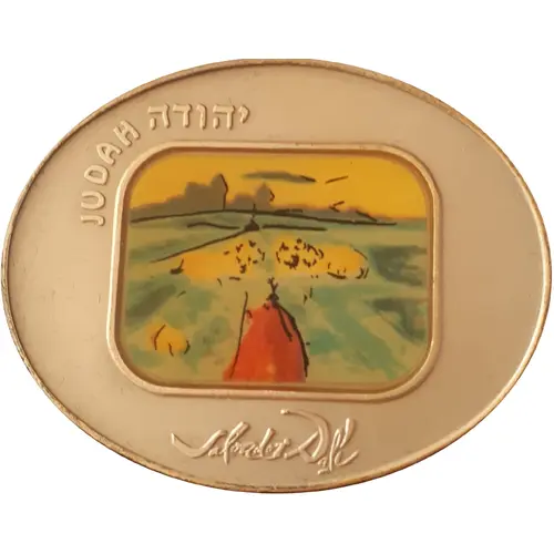 Tribe of `Judah` - colored silk-screen depicting crouching Ions. In the foreground is the image of a king, and in the background, the skyline of Jerusalem. Above, the ascription `JUDAH` in Hebrew and English. Below, the artist`s signature. |