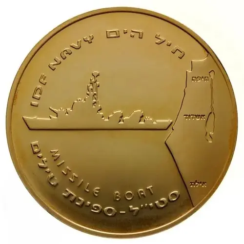 A Missile Boat and to its right, a schematic map of Israel, showing the main port cities: Haifa, Ashdod and Eilat. In the upper border `IDF Navy` in English and Hebrew, and in the lower border `Missile Boat` in English and Hebrew. |
