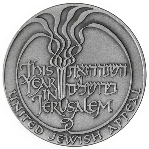 In the center an inscription forming the flame of a torch: `This year in Jerusalem` in Hebrew and English. At the bottom of the rim, in English `United Jewish Appeal`. |
