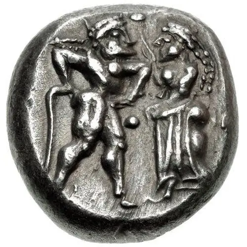 | Obverse description | Ithyphallic satyr standing right, hands placed on hips, confronting nymph standing right, raising right hand in protest, her left hand placed forward in a plea-like gesture; three pellets around. |