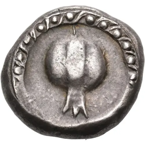 | Obverse description | Pomegranate with stem at the top and remains of the blossom below; all within a dotted cable border. |