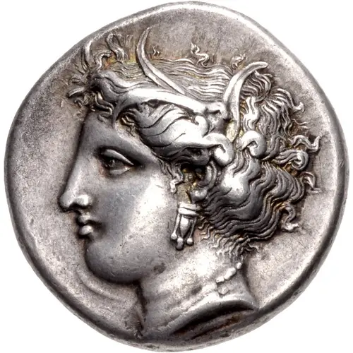 | Aversbeschreibung | Head of Persephone left, wearing wreath of grain ears, triple-pendant earring, and pearl necklace |