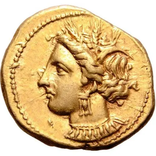 | Obverse description | Head of Tanit left, wreathed with corn, wearing necklace and triple-drop ear-ring |