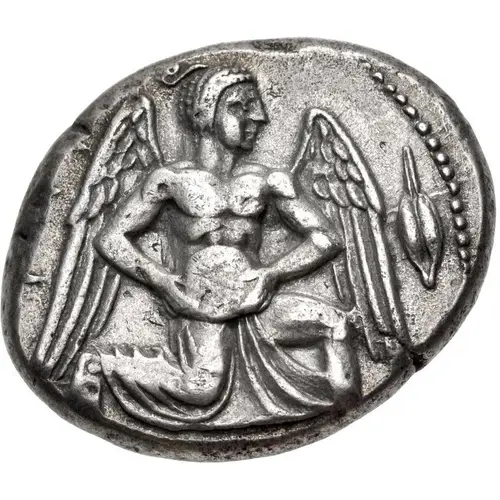 Historical Context: This silver stater was issued by Mallos, an important coastal city in ancient Cilicia, between 440 BC and 390 BC. This period falls within the Late Classical era, a time of significant political and economic interaction between the Greek world and the Achaemenid Persian Empire. Mallos, strategically located near the Pyramus River, functioned as a semi-autonomous city-state, often under Persian suzerainty but retaining the right to mint its own coinage, underscoring its regional economic influence and participation in Mediterranean trade.