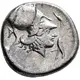 Artistry: The design adheres closely to the established Corinthian colonial prototype, reflecting Ambracia's cultural and political ties. While the specific engraver remains anonymous, the coin exhibits characteristics of the Early to High Classical stylistic period. The obverse masterfully depicts Pegasus flying left, often with a koppa (Q) symbolising Corinth. The reverse typically features a finely rendered head of a goddess, often Athena in a Corinthian helmet, frequently accompanied by a distinctive local symbol.