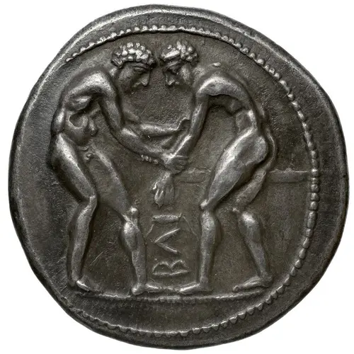 | توضیحات روی سکه | Two nude wrestlers grappling with each other, between them, BΛI. |