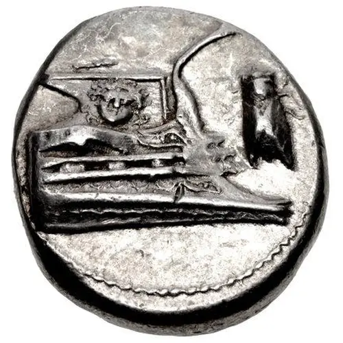 | Obverse description | Prow of galley right, fighting platform decorated with facing gorgoneion; to right, cicada upward. |