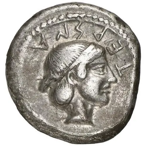 | 表面の説明 | Head of the nymph Terina to right, her hair bound with a fillet and tied up at the back |