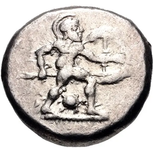 | Obverse description | Warrior advancing right, holding shield and spear and tortoise between legs |