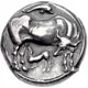 | Obverse description | Cow standing right, suckling calf standing left, below; above, dolphin right. |