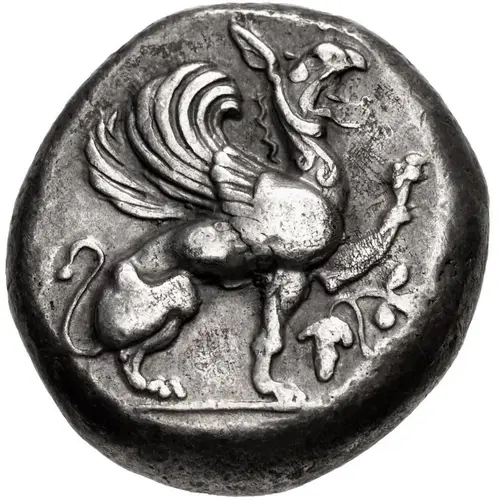 | Obverse description | Griffin with curled wings seated right, raising forepaw; grape bunch on vine to right. |