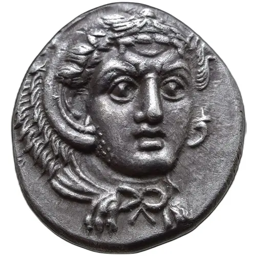 توضیحات روی سکه Head of Herakles, facing slightly to right, wearing lion skin headdress tied at neck.