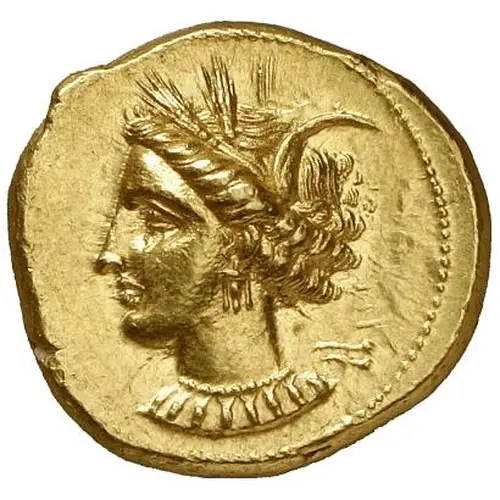 | Obverse description | Head of Tanit, left, wearing grain wreath, triple-pendant earring and pendant necklace. |