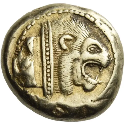 | Obverse description | Lion`s head right with dotted collar; behind, two raised squares. |