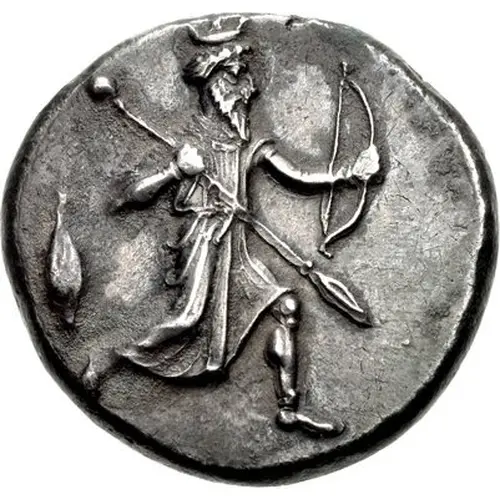 | Aversbeschreibung | Persian king, wearing kidaris and kandys, in kneeling-running stance right, holding spear in right hand, bow in left; barley grain to left |