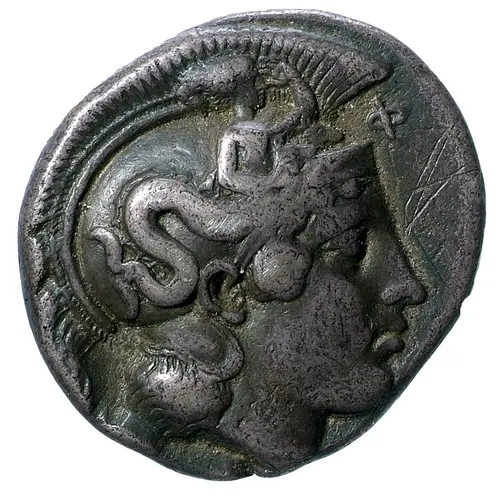 | Obverse description | Head of Athena to right, wearing crested helmet ornamented with Skylla. |