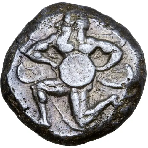 | Obverse description | Bearded and winged male deity in kneeling-running stance to right, holding solar disc with both hands |