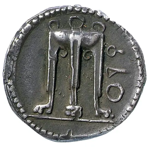 | Popis líce | Tripod with three handles and legs ending in lions’ paws. Border of dots. |