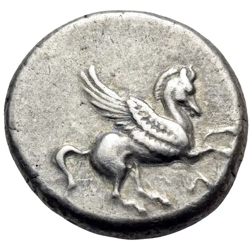 | Reverse description | Head of Athena to right wearing plain Corinthian helmet; behind her neck, kantharos. |