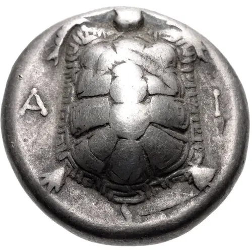 Popis rubu Quadripartite incuse pattern. Letter N in upper left part, letter I in upper right part and a dolphin in lower left part.