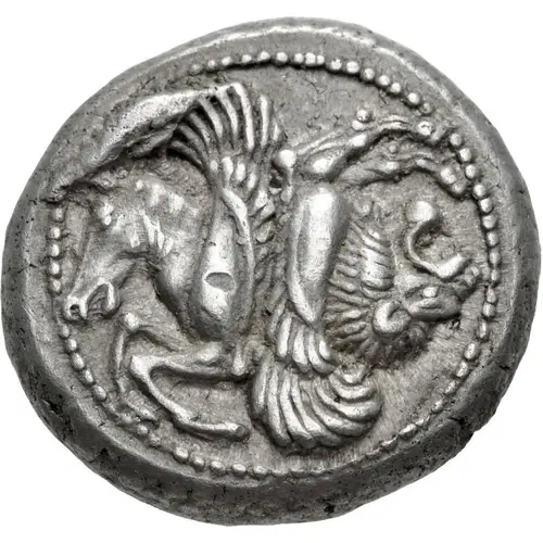 | Obverse description | Foreparts of winged lion and Pegasos joined at truncation, inverted from one another. |