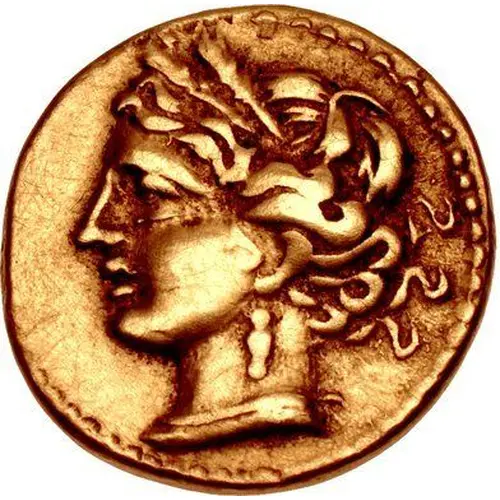 | توضیحات روی سکه | Head of Tanit left, wreathed with corn, wearing necklace and ear-ring. |