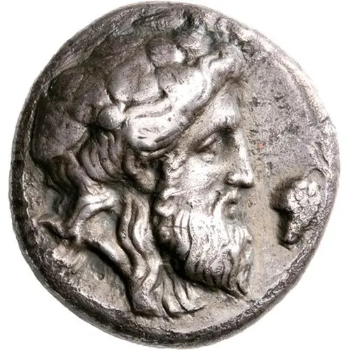 | Beschrijving voorzijde | Bearded head of Dionysos facing right, wearing a wreath of vine leaves. To his right, a bunch of grapes. |