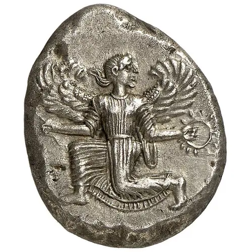 | Description de l’avers | Winged female figure in kneeling-running stance left, head turned right, holding kerykeion in left hand and wreath in right. |