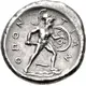 | Reverse description | Ajax, nude but for crested Corinthian helmet, holding sword in right hand, shield decorated with coiled serpent on left arm, advancing right on rocks; OΠON-TIΩN flanking; below, spearhead right. |